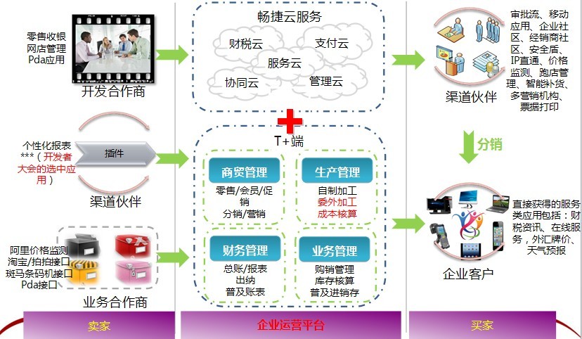 T+产品不仅可实现企业内部采购、销售、仓库、生产、财务的管理;其全新的B/S架构,让您可轻松实现对异地仓库、办事处、门店、分公司的管理;与企业社交网络的融合,可实现供应商、经销商、客户的上下游管理。全面适应最新2013《小企业会计准则》,为企业打造全新的生意模式、管理模式、工作模式。与传统管理软件相比,“T+”更强调企业管理向企业经营的转变、等级化管人向平等化用人理念的转变。